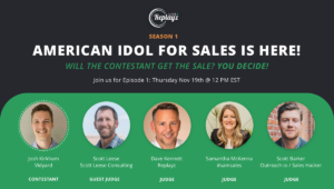 Join Replayz Live! for this fun and interactive 30 minute live discovery/demo role play virtual event in the style of American Idol.  Samantha McKenna, founder of #Samsales Consulting, joins Dave Kennett, founder & CEO of Replayz, and Scott Barker, Head of Strategic Engagement at Outreach.io, as the “judges.”  Together, with a special guest judge each week, they will moderate, participate, and give feedback on pitches from contestants.  As an audience participant, you will learn best practices, how to up your discovery and demo game, and gain access to a free highly niche slack group.  Check us out on the following dates: